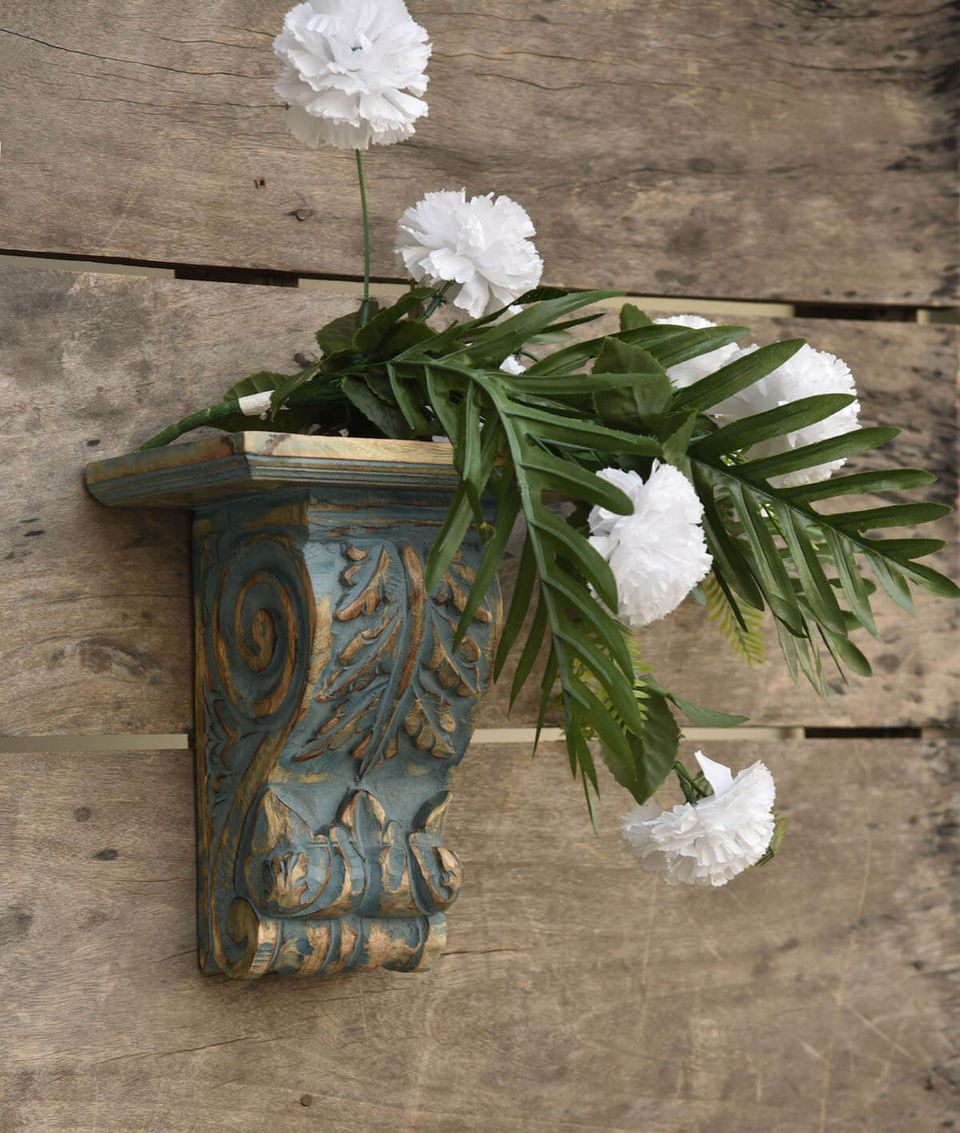 The rustic wooden wall bracket in teal blue gains its grandeur with the baroque carvings. It's a functional shelf and at the same time an art piece.